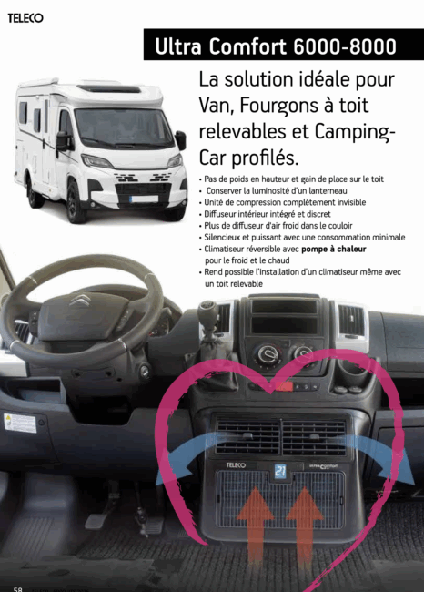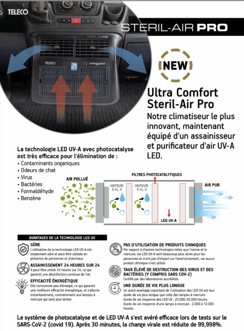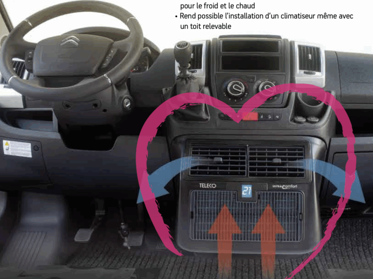L’AIRCO ULTRA COMFORT TELAIR (versions 6000 et 8000) est un climatiseur réversible “sans toit” : vous conservez vos lanterneaux et votre hauteur, avec un soufflage par le bas, plus doux et silencieux. Deux déclinaisons : Standard (performances thermiques) ou SterilAir Pro (assainissement d’air). Idéal vans, toits relevables et profilés.