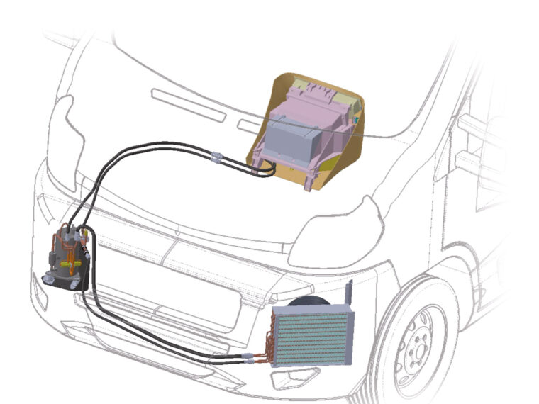 Unité extérieure en 2 parties reliées par tuyaux derrière le pare-chocs