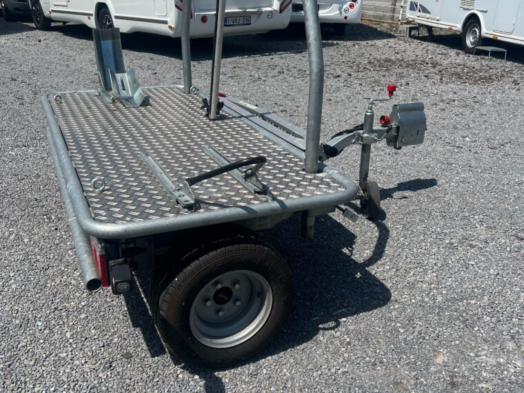 Découvrez cette remorque porte-moto transversale d’occasion, spécialement conçue pour les camping-caristes qui souhaitent transporter leur moto en toute sécurité sans encombrer l’arrière du véhicule.
